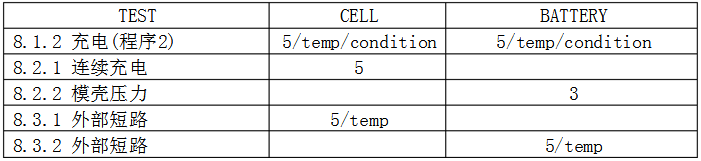 B)測試:一個完全放電的電芯能夠承受1ItA的電流反充電90min. C)接受條件:不起火,不爆炸。 8詳細(xì)要求和測試(鋰系列)