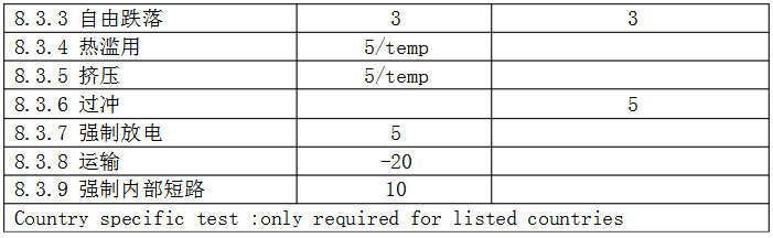 如果電芯被規(guī)定的最高或最低充電溫度超過了表4中預(yù)估的最高或最低溫度,那么這個電芯可以充電,如果適合試驗,應(yīng)在規(guī)定預(yù)估中最高上限加5℃和在最低的下限減5℃。電芯應(yīng)該滿足條款8.3.1、8.3.2、8.3.4、8.3.5和8.3.9。還應(yīng)提供一個合理的闡述確保電芯的安全。